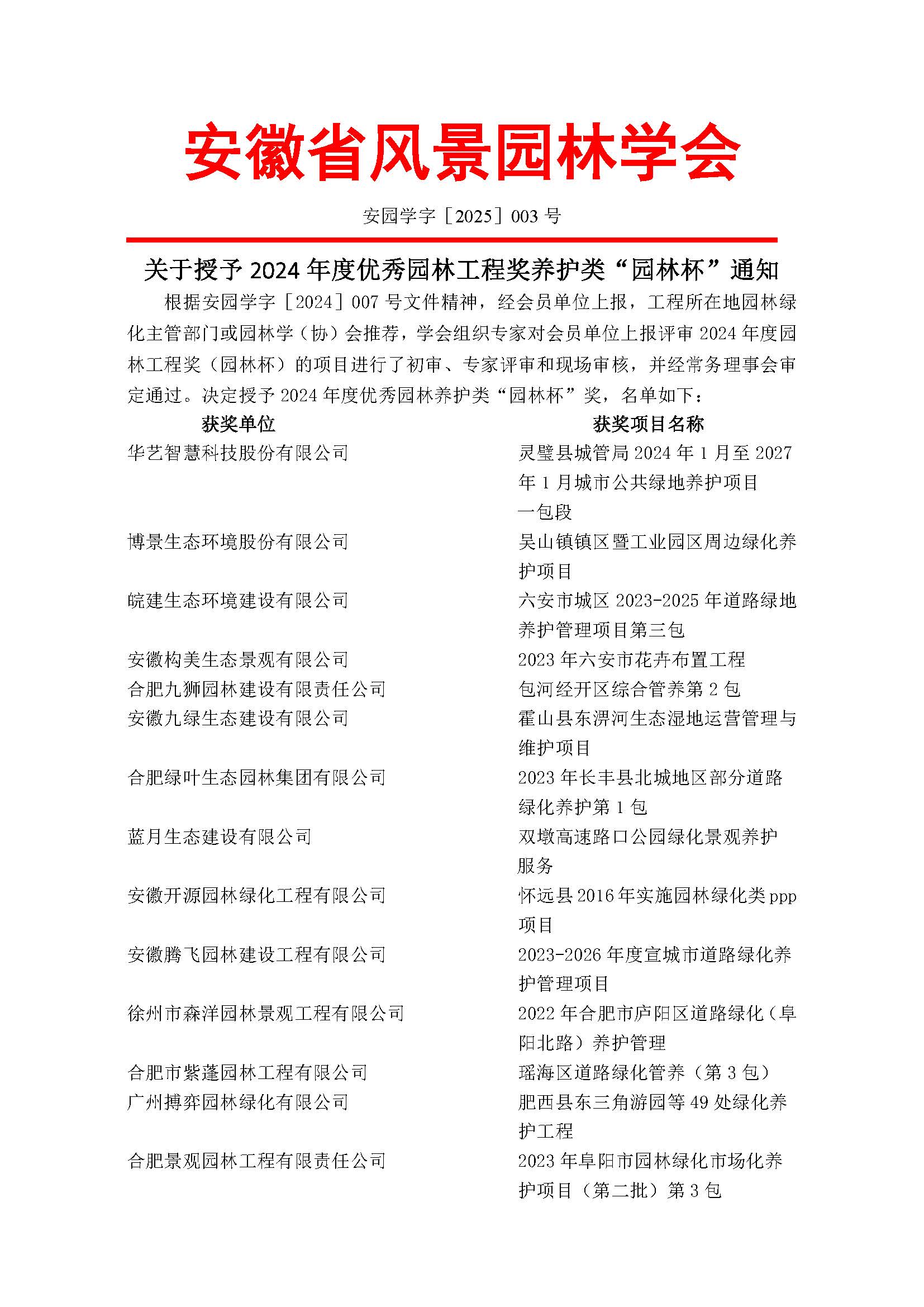 关于授予2024年度优秀园林工程奖养护类“园林杯”通知