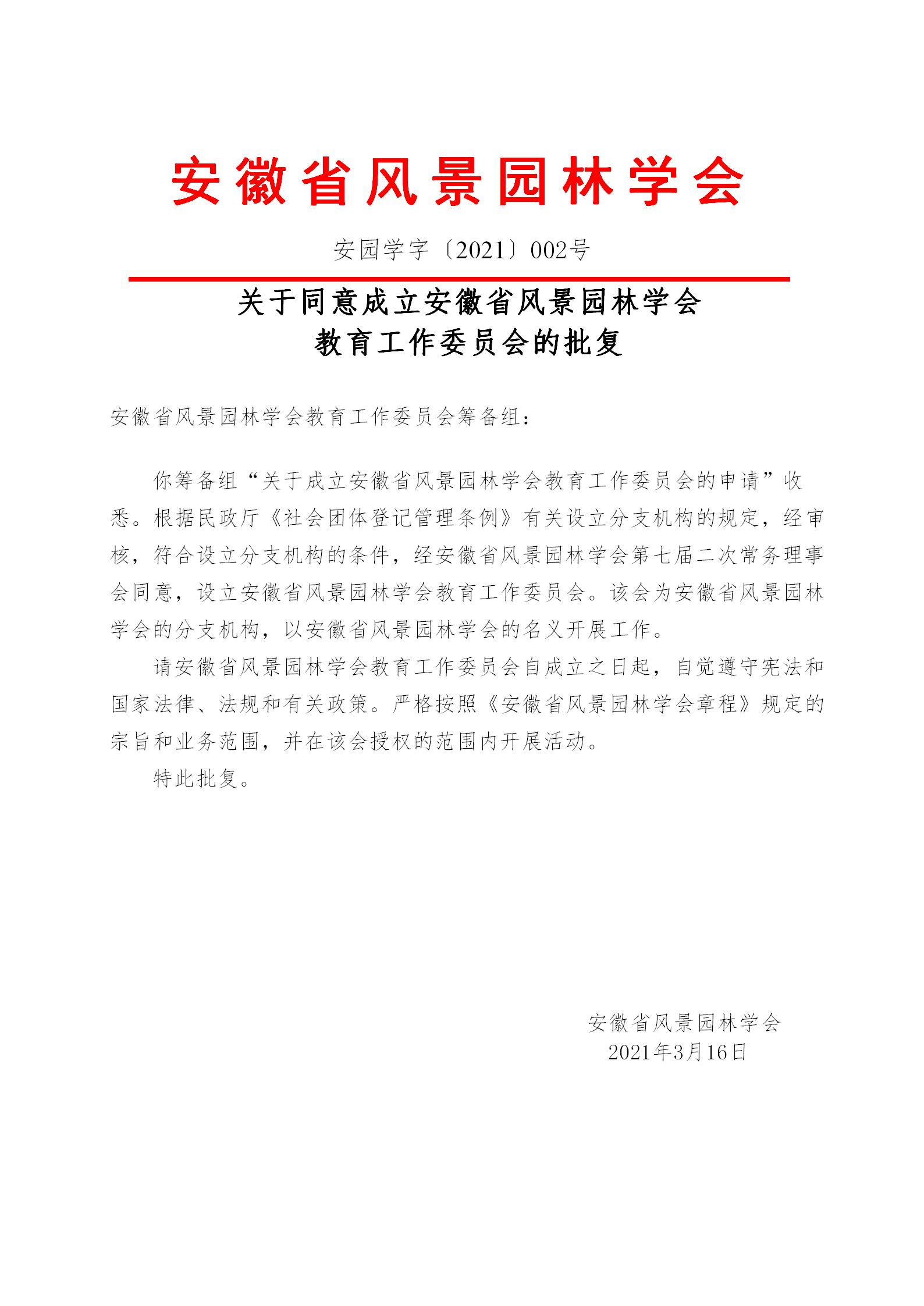 你筹备组“关于成立安徽省风景园林学会教育工作委员会的申请”收悉。根据民政厅《社会团体登记管理条例》有关设立分支机构的规定,经审核,符合设立分支机构的条件,经安徽省风景园林学会第七届二次常务理事会同意,设立安徽省风景园林学会教育工作委员会。该会为安徽省风景园林学会的分支机构,以安徽省风景园林学会的名义开展工作。